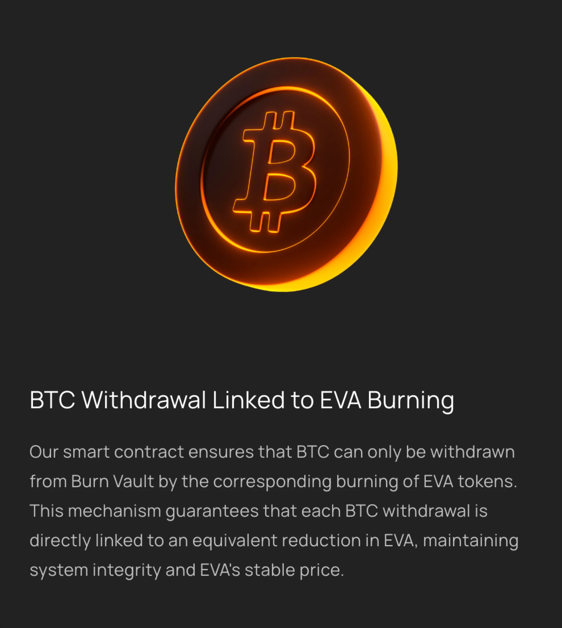 Additionally, in order to withdraw BTC from the vault (the Burn Vault), the user must burn their EVA tokens. This reduces supply and increases the value of the tokens still in circulation.