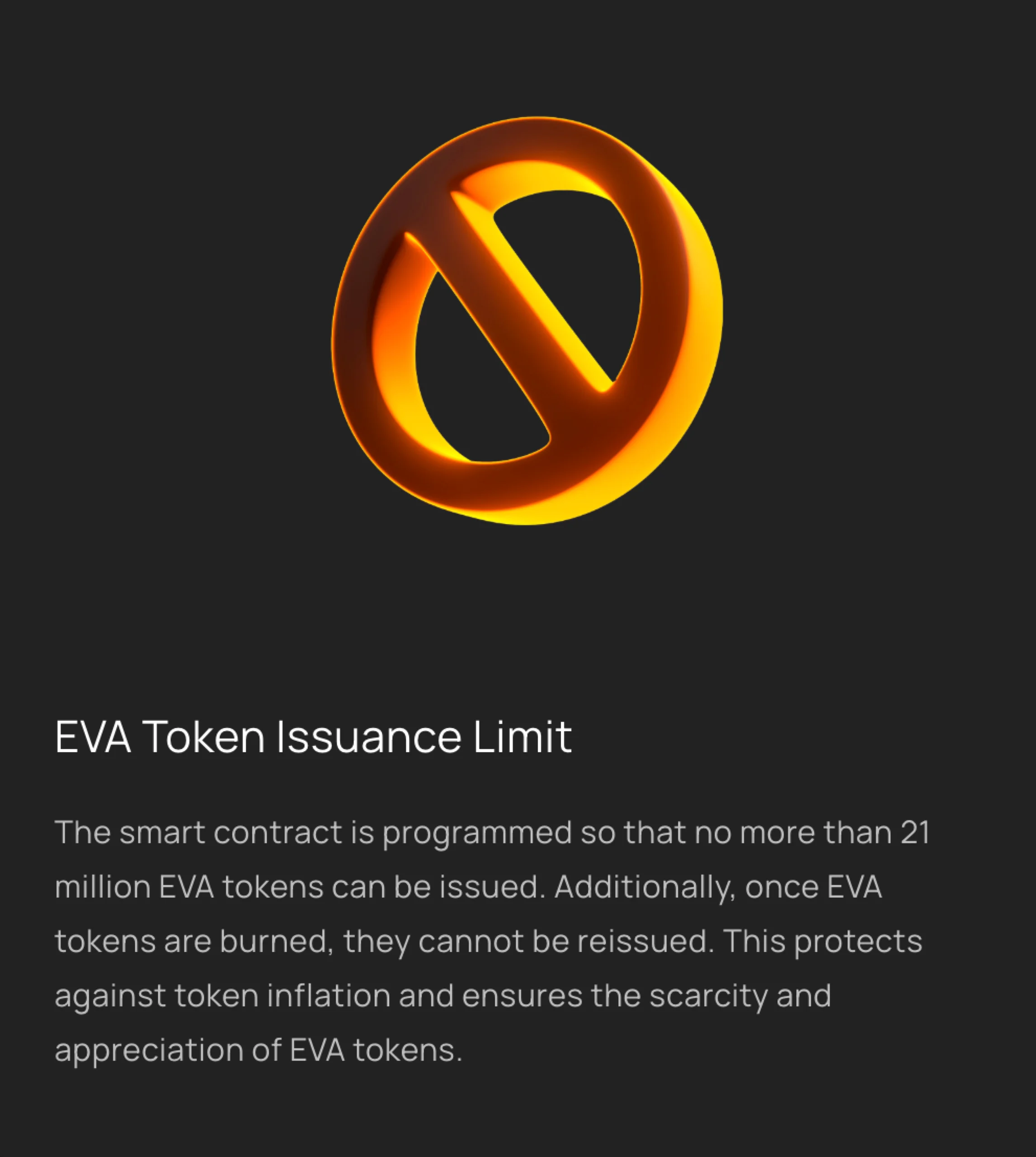 Only 21 million EVA tokens have been minted. No additional tokens can ever be created, ensuring absolute scarcity, just like Bitcoin.